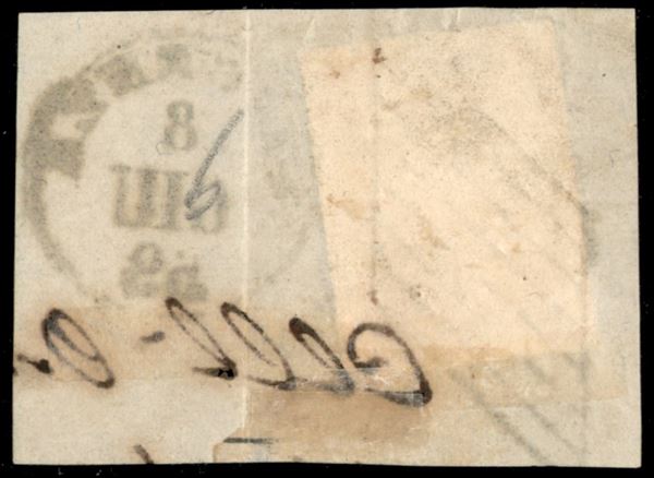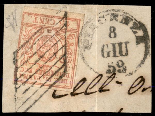 Frammento con c.15 vermiglio (9) annullato a griglia e cerchio PIACENZA 8 GIU.59, il giorno successivo la Duchessa Reggente abbandonò definitivamente il Ducato ed iniziò il Secondo periodo Governo Provvisorio, rarità