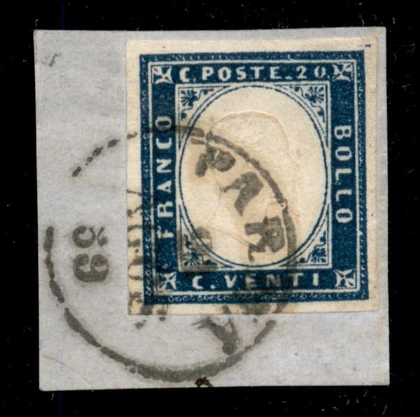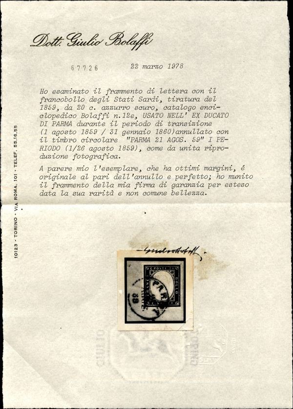 Frammento con Sardegna c.20 azzurro scuro annullato PARMA 21 AGO.59, cert. G. Bolaffi