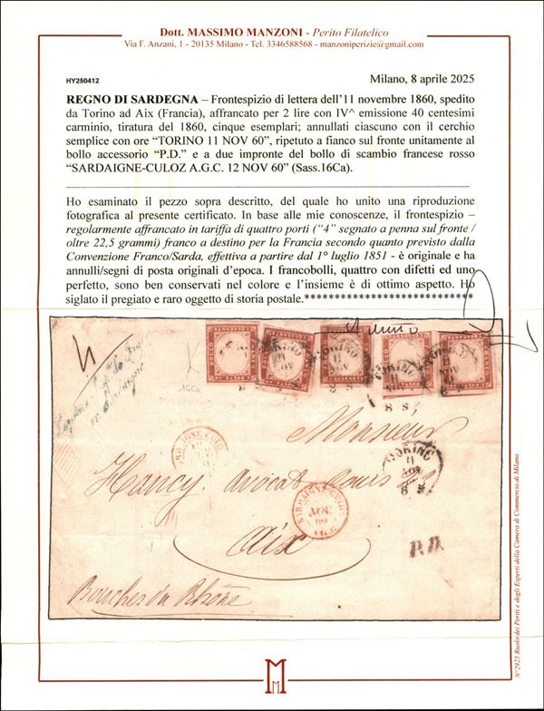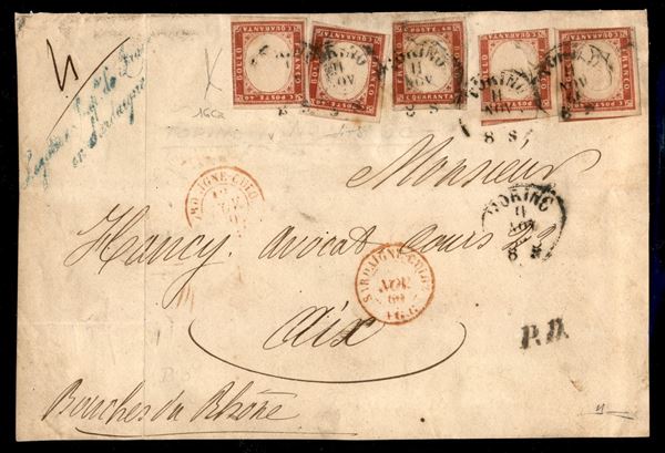 Frontespizio affrancato con cinque esemplari del 40 cent carminio (16Ca) da Torino a Aix del 11.11.60 - quattro esemplari margini corti - raro insieme - cert. Manzoni