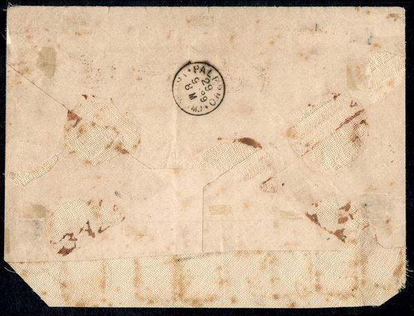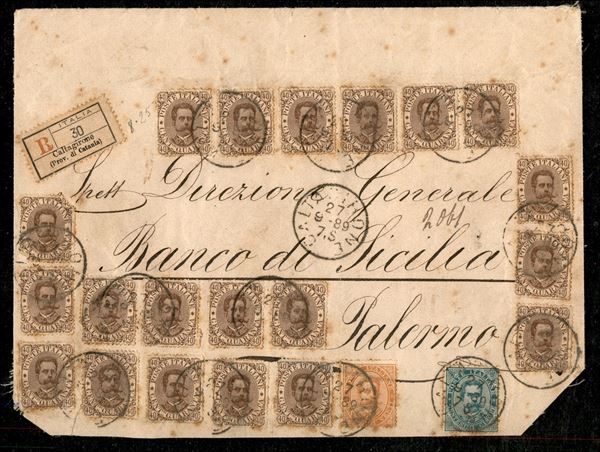 Frontespizio di raccomandata quaranta porti per l'interno affrancata con c.5 verde + c.20 arancio + venti esemplari del c.40 bruno (37 + 38 + 45) da CALTAGIRONE 27.9.89 per Palermo, qualche ingiallimento, raro porto multiplo
