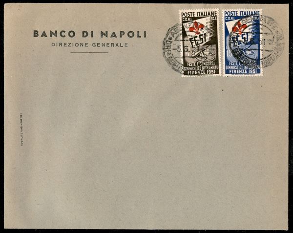 Ginnici - 5 lire (661) + 15 (663) usati su busta da Banco di Napoli/Agenzia P.T. predisposta all'uso