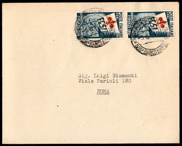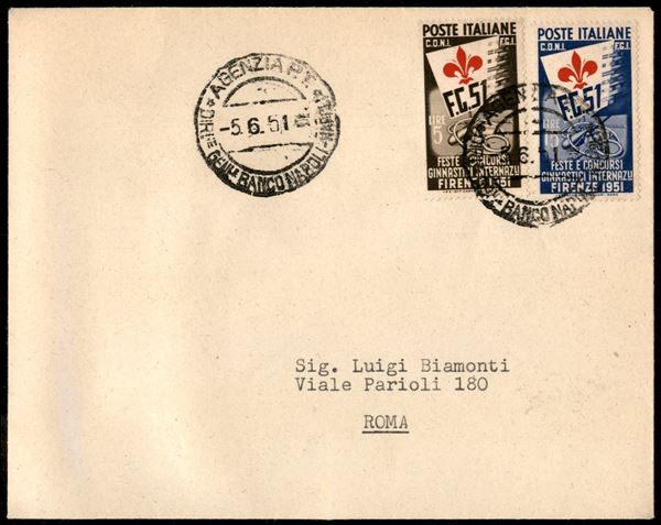 Ginnici - due buste dall'Agenzia P.T. del Banco di Napoli per Roma del 5.6.51 con affrancature della serie (561 + 563 - 562 coppia)
