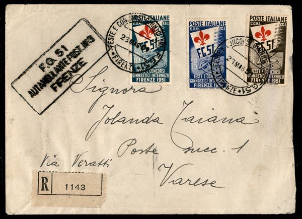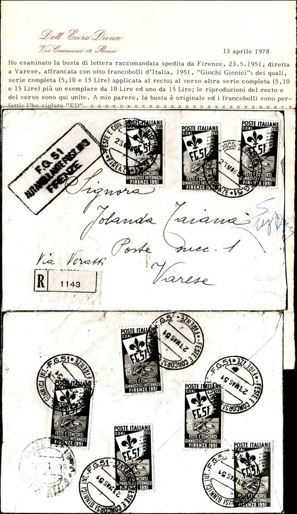 Ginnici (661/663) - affrancatura multipla fronte retro con 15 lire (663c) giglio a sinistra - raccomandata per Varese del 23.5.1951 - cert. En. Diena