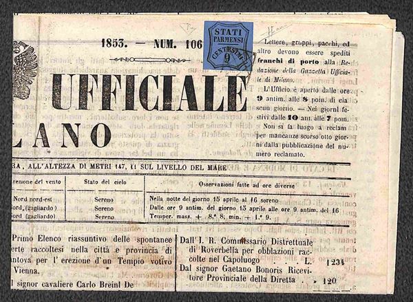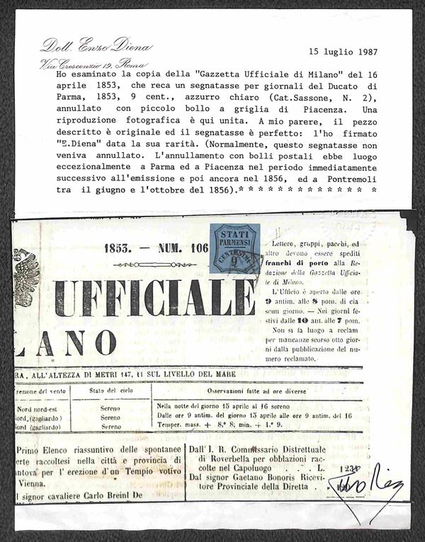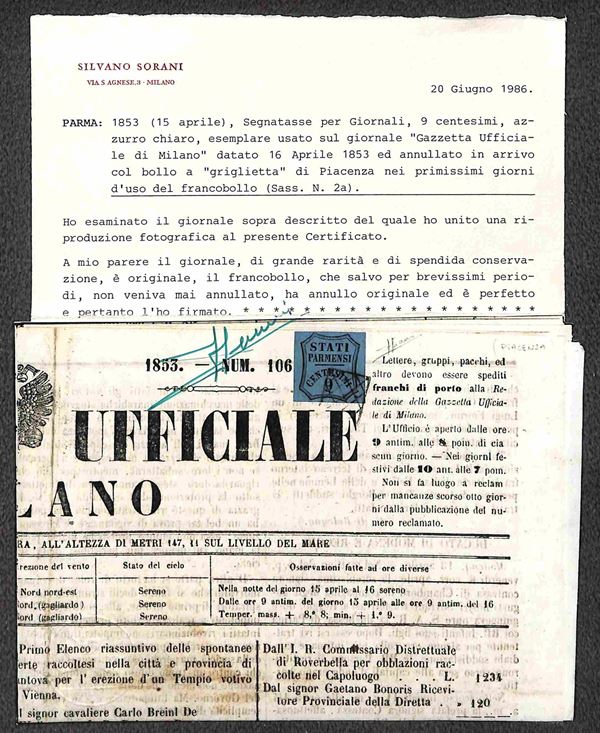 Giornale GAZZETTA UFFICIALE DI MILANO del 16 aprile 1853 con segnatasse c.9 azzurro annullato a griglietta, si tratta di una delle prime date note, di grande qualità. Cert. E.Diena, Sorani