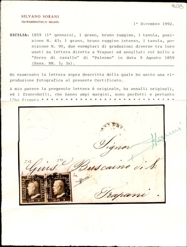 Lettera affrancata con 1 grano bruno ruggine I tavola pos.43 + 1 grano bruno ruggine intenso I tavola pos.90 (3 + 3a cat.17500) da Palermo 9 agosto 1859 per Trapani - firma Chiavarello + cert. Sorani