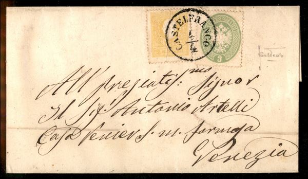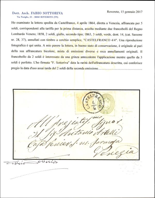 Lettera affrancata con 2 soldi secondo tipo (28) pił 3 soldi (37) ben dentellati - Castelfranco 4.4.64 - uso tardivo del 2 soldi (grinza d'applicazione) - rara mista - cert. Sottoriva