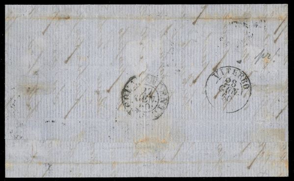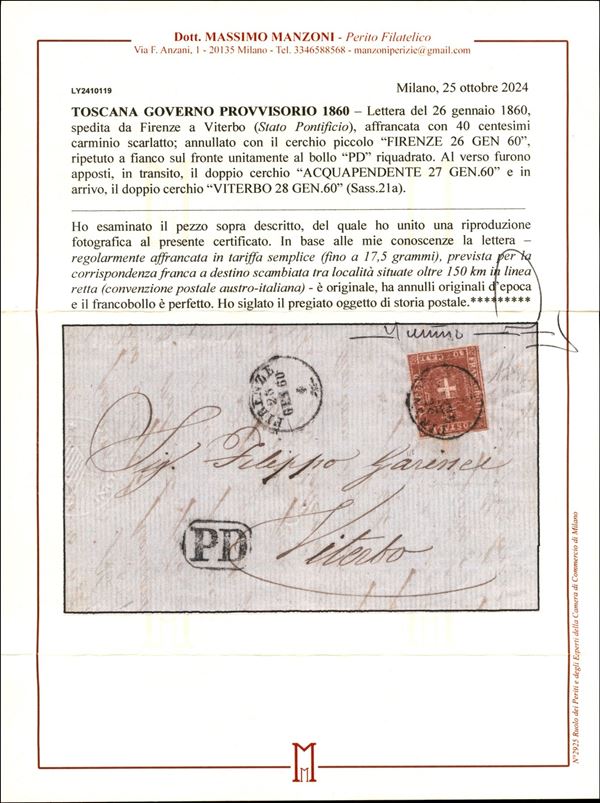 Lettera affrancata con 40 cent carminio scarlatto (21a) da Firenze a Viterbo del 26.1.60 - margini integri - molto bello - cert. Manzoni