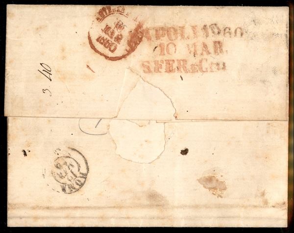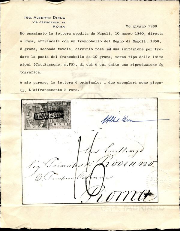 Lettera affrancata con 5 grana rosa carminio II tavola + un falso per posta del 10 grana carminio III tipo (9 + F5 cat.20000) da Napoli 10 MAR 1860 per Roma - leggera piega d'archivio ma di ottimo aspetto - cert. Alberto Diena