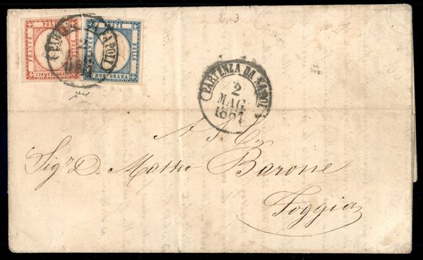 Lettera affrancata con 5 grana rosso carminio + 2 grana azzurro chiaro con traccia di filetto di inquadratura superiore (20 + 21 cat.1350) annullati Partenza da Napoli MAG.1861 per Foggia - firma Chiavarello