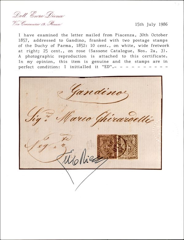 Lettera affrancata con c.10 bianco, greca larga a adestra + c.15 rosa (2a+3) da PARMA 30 OTT.57 per Gandino, ex collezione Rothschild, cert. E.Diena, Bolaffi
