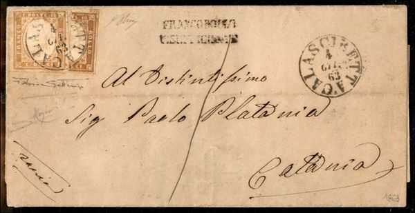 Lettera affrancata con c.10 bistro chiao + c.10 bistro fraz. verticalmente e usato per 5 cent (14E+14Ea) annullati con bollo sardo italiano di CALASCIBETTA 4 OTT.63 diretta a Catania. Al recto il FRANCOBOLLO INSUFFICIENTE e la tassa di 1 decimo di lira non essendo stato ritenuto valido frazionamento. Una delle poche lettere note col frazionamento del 10 cent abbinato ad altro 10 cent non frazionato. Ex vendita Raybaudi n.9 del 1960. Firma per esteso L.Raybaudi e cert. F.Sottoriva, Grande rarita