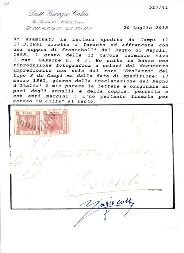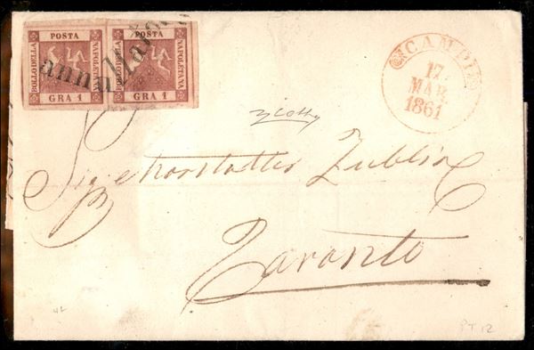 Lettera affrancata con coppia gr.1 carminio vivo, seconda tavola, (4) bordo di foglio a destra, colore vivo e assai fresco, con annullo a svolazzo di CAMPI 17 MAR.1861, Giorno della proclamazione del Regno d'Italia, diretta a Taranto, cert. G.Colla