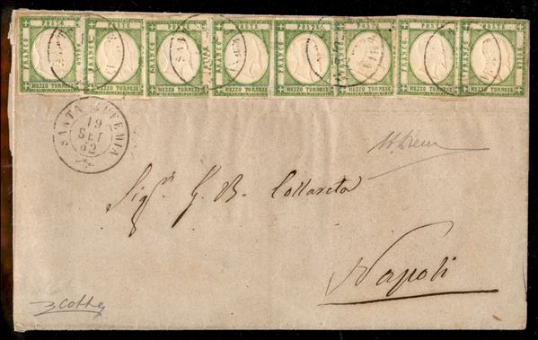 Lettera affrancata con otto francobolli delle Provincie Napoletane da 1/2 tornese verde giallo (Catalogo Sassone 17e) annullati con bollo a doppio cerchio di fornituta luogotenenziale SANTA EUFEMIA 19 SET.62 diretta a Napoli. Annullo estremamente raro, probabilmente unico, impreziosito dalla non comune affrancatura (P.ti R2). Lettera riprodotta sul catalogo Sassone Annullamenti a pag.352 edizione 2021. Cert. E.Diena, G.Colla