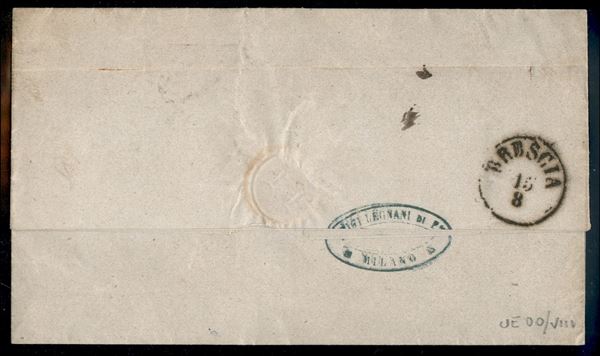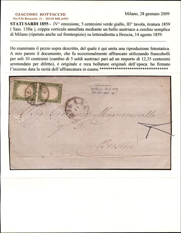Lettera affrancata con Sardegna coppia verticale c.5 verde giallo (13Ba) in frode tariffaria; cambio 5 soldi austriaci pari a 12,35 centesimi sardi arrotondato per difetto) da MILANO 14/8 del 1859 per Brescia, cert. G.Bottacchi, Raybaudi