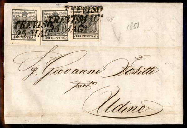 Lettera affrancata con tre 10 cent (2) ottimamente marginati da Treviso a Udine del 25.5.51 - cert. E. Diena