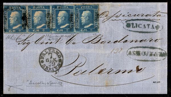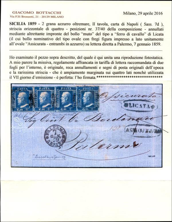 Lettera assicurata affrancata con gr.2 azzurro oltremare, seconda tavola, striscia orizzontale di quattro, da LICATA ovale + ASSICURATA ovale, entrambi in azzurro diretta a Palermo ove giunge il 7 gen.59, primi giorni d'uso dei francobolli Siciliani. Si tratta di una delle due striscie note di questa rara varietà di colore, assai fresca e vivace e di grande qualità, cert. Giulio Bolaffi, G.Bottacchi
