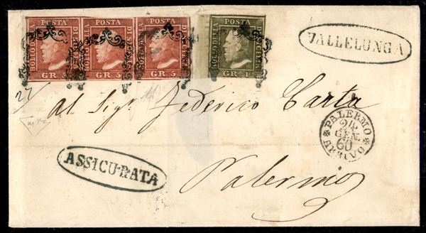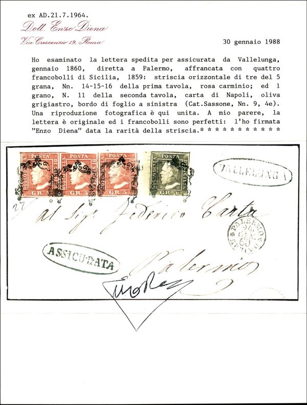 Lettera assicurata da VALLELUNGA per Palermo 24 gen.60 affrancata con striscia orizzontale di tre gr.5 rosa carminio (pos 14, 15, 16) + gr.1 oliva grigiastro, seconda tavola con ampio bordo di foglio a sinistra (4e + 9), affrancatura da 16 grana, insieme di qualità, cert. E.Diena
