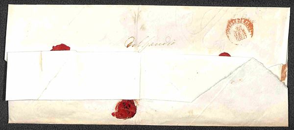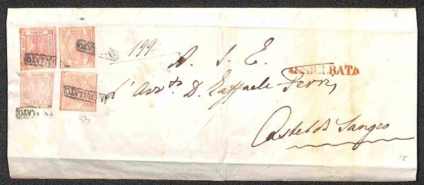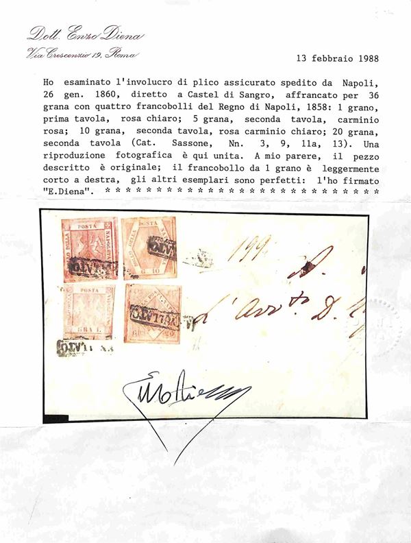 Lettera assicurata quadricolore da Napoli 26 GEN.60 per Castel di Sangro con 1 grano rosa chiaro + 5 grana carminio rosa + 10 grana carminio chiaro + 20 grana rosa chiaro (3 + 9 + 11a + 13) - cert Enzo Diena