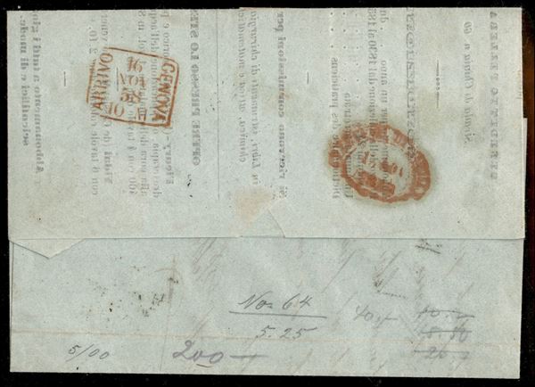 Lettera con affrancatura tricolore composta da 1 grano rosa chiaro + 5 grana rosa brunastro + 10 grana rosa brunastro (3 + 8 +10) da Napoli 15 NOV.1858 con a lato il bollo rosso su tre righe "Via i Mare (E)" diretta a Genova e tassata 15 centesimi a tampone - firma Chiavarello