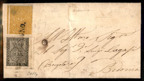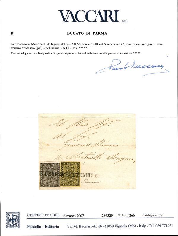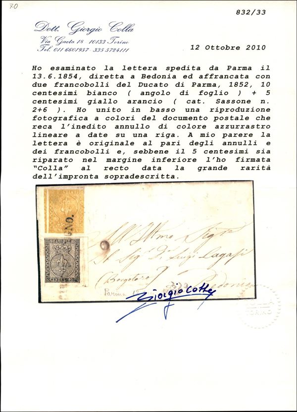 Lettera con c.10 nero, angolo di foglio prima emissione + c.5 giallo arancio seconda emissione con lineare su una riga PARMA 13 GIUGNO del 1854 per Bedonia, cert. Vaccari e G.Colla