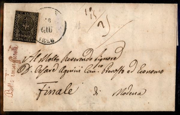 Lettera con c.15 rosa da PIACENZA 16 GIU.1856 diretta a Finale di Modena, con a lato il bollo corsivo in rosso Bollo Insufficiente e tassazione dettagliata 10_15/25 di cui "10" per porto mancante, "15" di sanzione per totali 25 centesimi a carico del destinatario