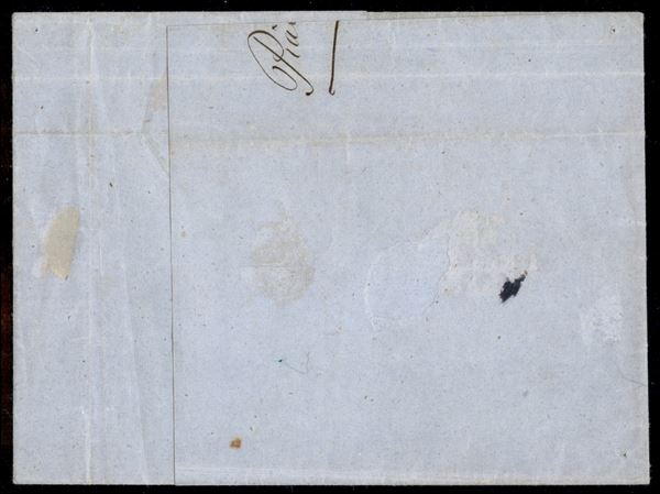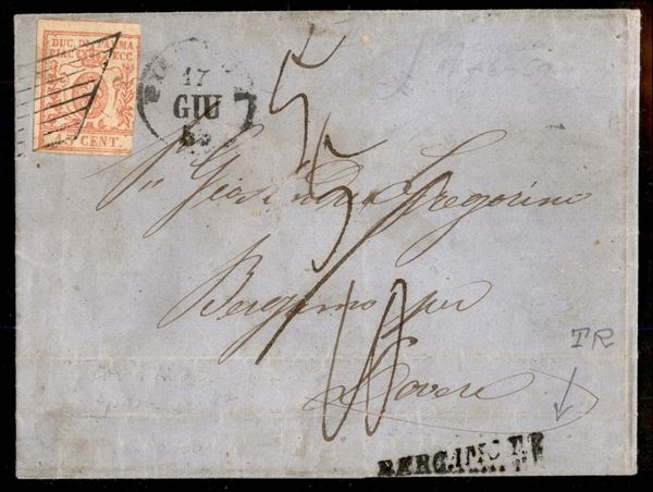 Lettera con c.15 vermiglio (9), corto a destra, da PIACENZA 17 GIU.59 per Bergamo in periodo di Governo Provvisorio con BOLLO BERGAMO T.R. e tassazione manoscritta 5/5/10 soldi, rara