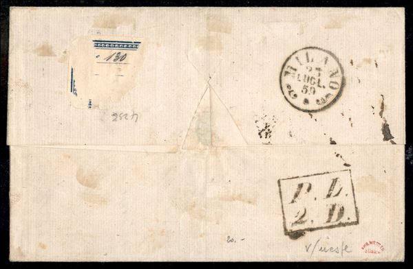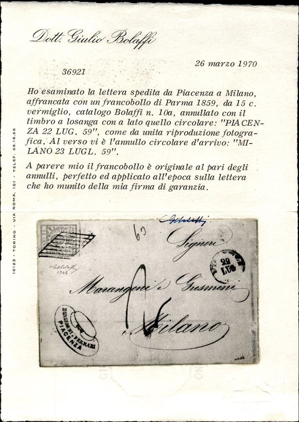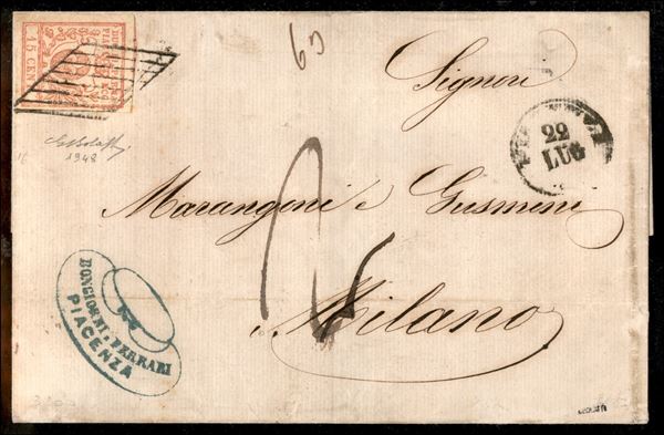 Lettera con c.15 vermiglio annullo a losanga di PIACENZA 22 LUG.59 per Milano, tassata per 2 soldi corrispondenti ai 5 centesimi mancanti, secondo periodo del Governo Provvisorio, cert. G.Bolaffi