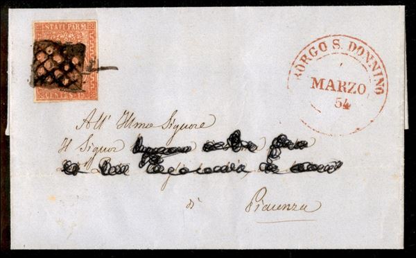 Lettera con c.15 vermiglio con annullo a griglietta + d.c. rosso BORGO S.DONNINO 4 MARZO 1854 per Piacenza, annullo a griglia molto inchiostrato
