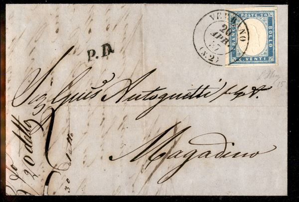 Lettera con c.20 cobalto latteo (15) annullato VERBANO (N°2) 20 APR.57 per Magadino, raro e SPL
