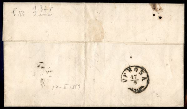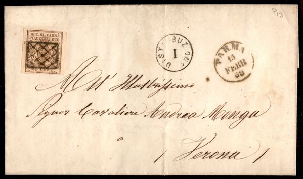 Lettera con c.25 bruno lilla (10) annullato a griglietta con a lato il cerchio piccolo di PARMA 13 FEBB:59 (P.ti 13) per Verona, sul fronte il bollo DISTRIBUZIONE I di Verona, bella qualità