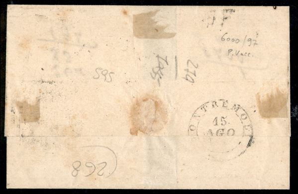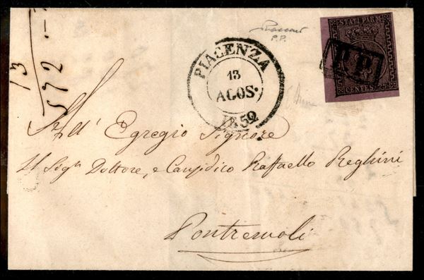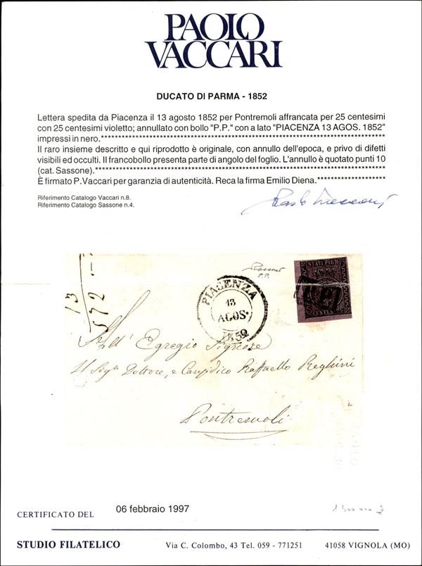 Lettera con c.25 violetto, angolo di foglio, da PIACENZA 13 AGOS.1852 per Pontremoli con annullo P.P. in cartella sul francobollo (P.ti 10), cert. P.Vaccari