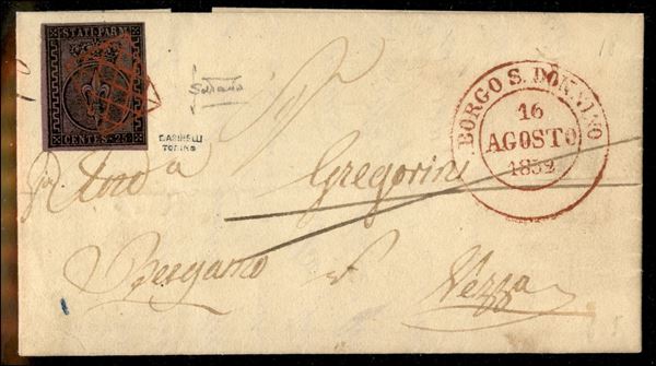 Lettera con c.25 violetto annullo a griglietta rossa + d.c. rosso BORGO SAN DONNINO 16 AGOSTO 1852 per Vezza, bella combinazione rara e di effetto (P.ti 10)