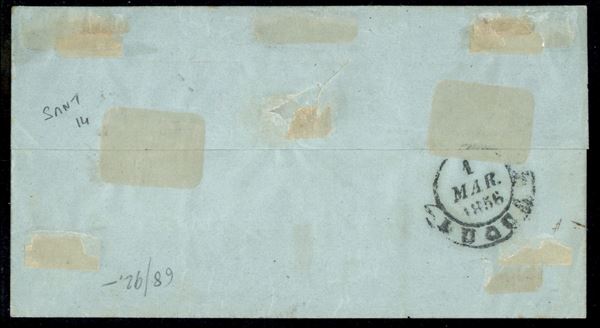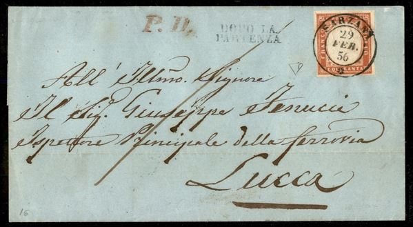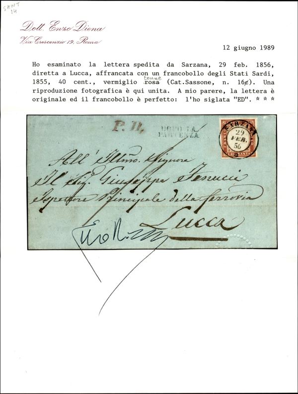Lettera con c.40 vermiglio da SARZANA 29 FEB.56 per Lucca con a lato il bollo P.D. in rosso + lineare DOPO LA PARTENZA, cert. E.Diena