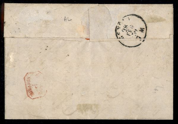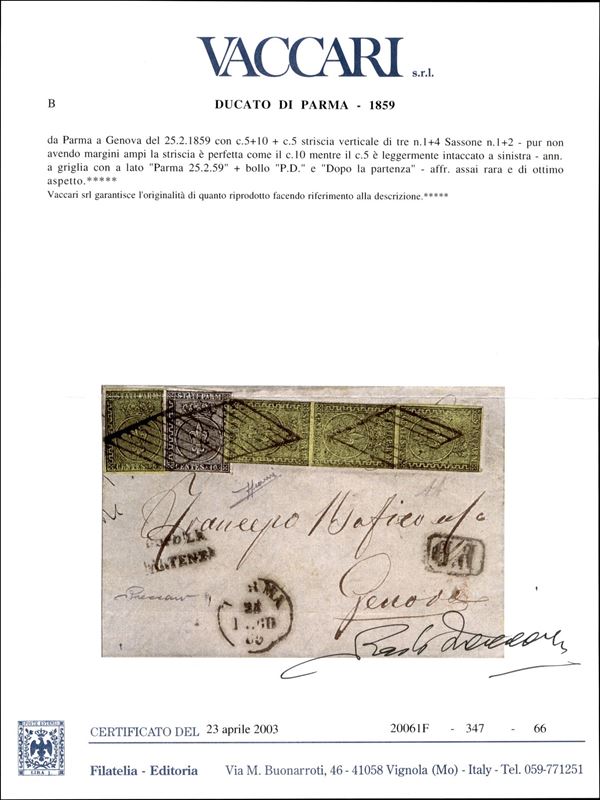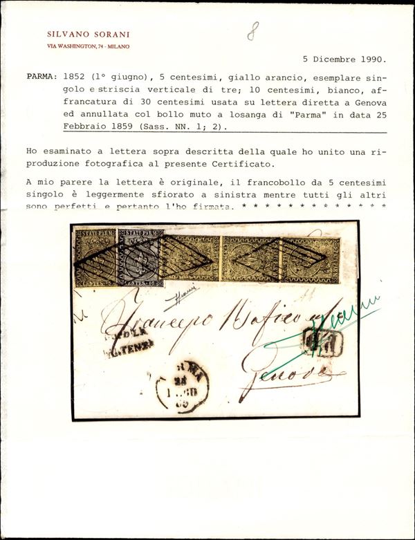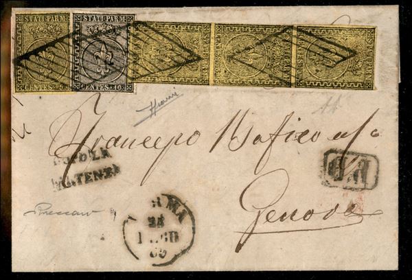 Lettera con c.5 giallo singolo pił striscia verticale di tre + c.10 nero annullati a losanga + cerchio piccolo PARMA 25 FEBB.59, a lato i bolli DOPO LA PARTENZA E P.D. in cartella, in esatta tariffa per Genova, la losanga fu data in uso ai soli uffici di Parma e Piacenza tra la fine di febbraio e inizio marzo 1859, questa rappresenta la prima data nota dell'ufficio di Parma. Cert.Sorani, P.Vaccari