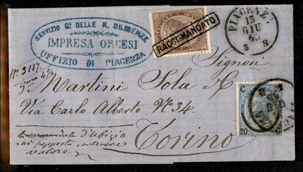 Lettera con cent 20/15 III tipo annullato PIACENZA 13 GIU.65 + c.30 bruno (19) annullato con bollo in cartella RACCOMANDATO su missiva intestata "servizio G. delle R.Diligenze Ufficio di Piacenza Impresa Orcesi" e al verso sigillo in carta con bollo di Piacenza AMMINISTRAZIONE DELLE REGIE POSTE ITALIANE, sul recto manoscritto "Raccomandata d'ufficio chè supposta contiene valore" all'interno contiene vaglia come si rileva dal testo.