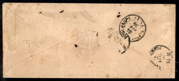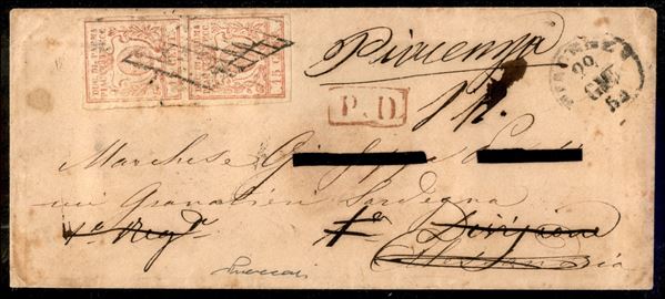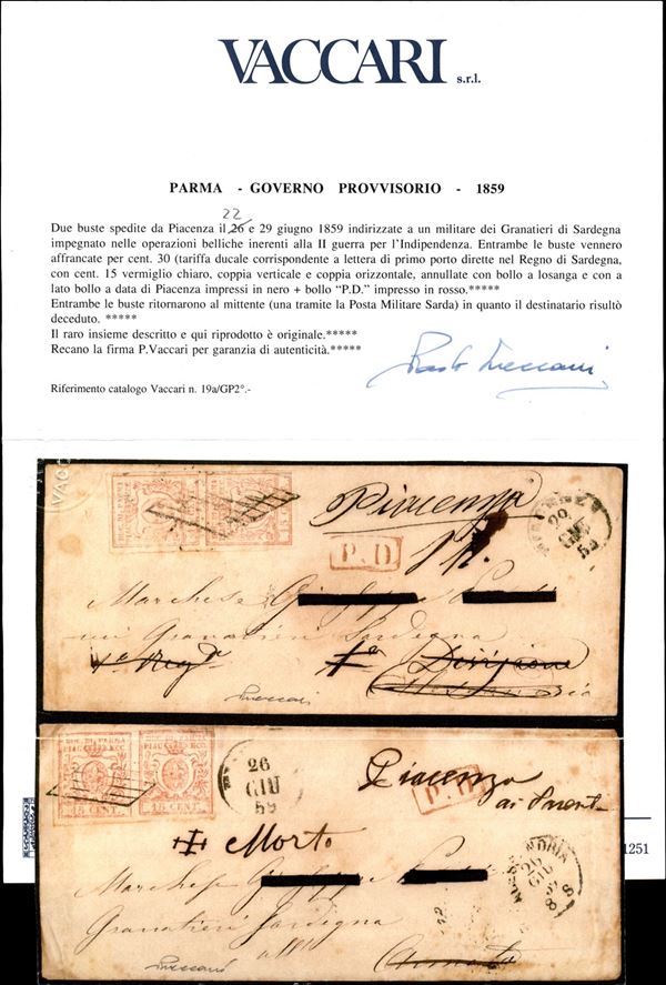 Lettera con coppia verticale c.15 vermiglio annullata a losanga di PIACENZA 22 GIU.59 diretta ad un militare dei Granatieri di Sardegna che risultò deceduto e quindi rispedita alla famiglia a Piacenza, cert. Vaccari