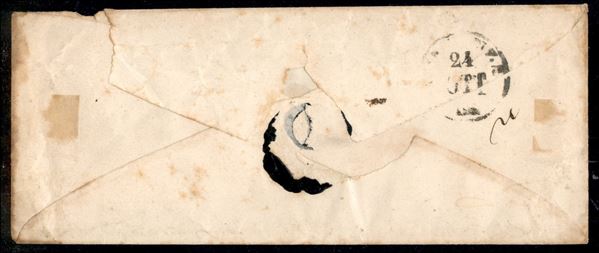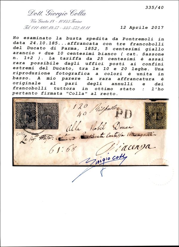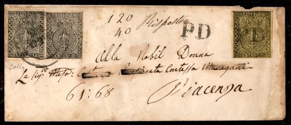 Lettera con due esemplari c.10 nero annullati con d.c./senza anno PONTREMOLI 24 OTT. + c.5 giallo arancio annullato col solo P.D. diretta a Piacenza, rara combinazione (P.ti 10), cert. Colla
