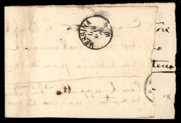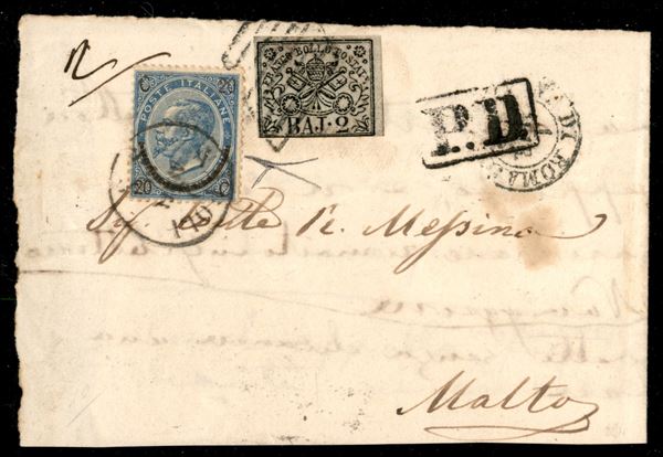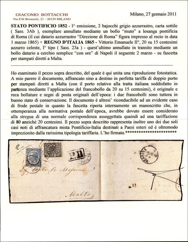 Lettera con Pontificio b.2 grigio azzurrastro (3Ab) annullato mediante bollo muto a losanga pontificia di Roma, a lato il bollo d.c. DIREZIONE DI ROMA 1 MAR.65 + Regno d'Italia c.20/15 celeste I° tipo (23a) annullato in transito con datario c.s./ore NAPOLI 2 MAR.65 su fascetta per stampati diretta a Malta, affrancato in tariffa di doppio porto per stampati diretti a Malta, grande rarità, cert. G.Bottacchi