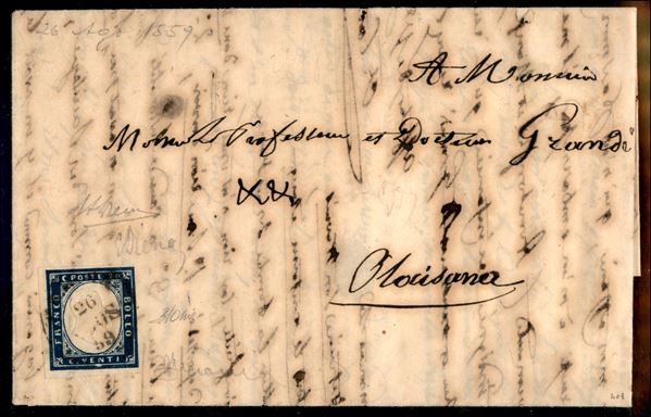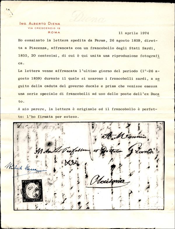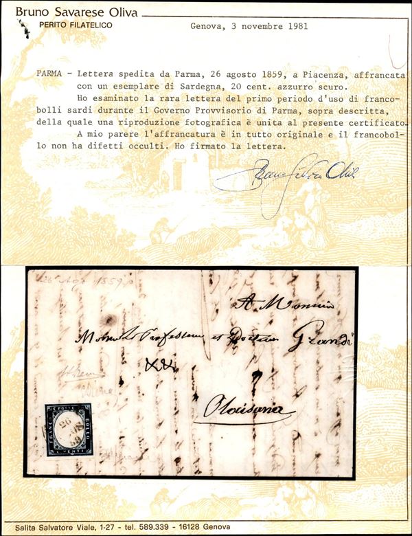 Lettera con Sardegna c.20 azzurro scuro annullato PARMA 26 AGO.59 per Piacenza, ultimo giorno del primo periodo di Governo Provvisorio, rara, cert. S. Oliva e A. Diena