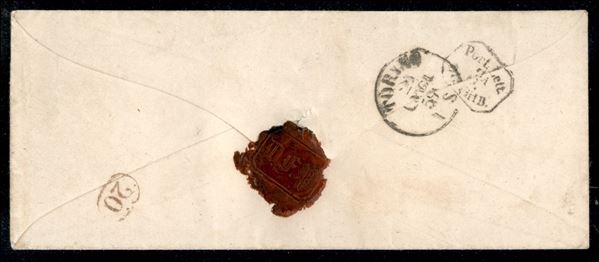 Lettera con striscia di tre c.10 nero da PIACENZA 20 LUG.59 per Torino, in eccesso di 10 centesimi in quanto affrancata con la vecchia tariffa ducale, mentre erano ormai in corso le tariffe sarde per le quali bastavano 20 centesimi per qualunque distanza