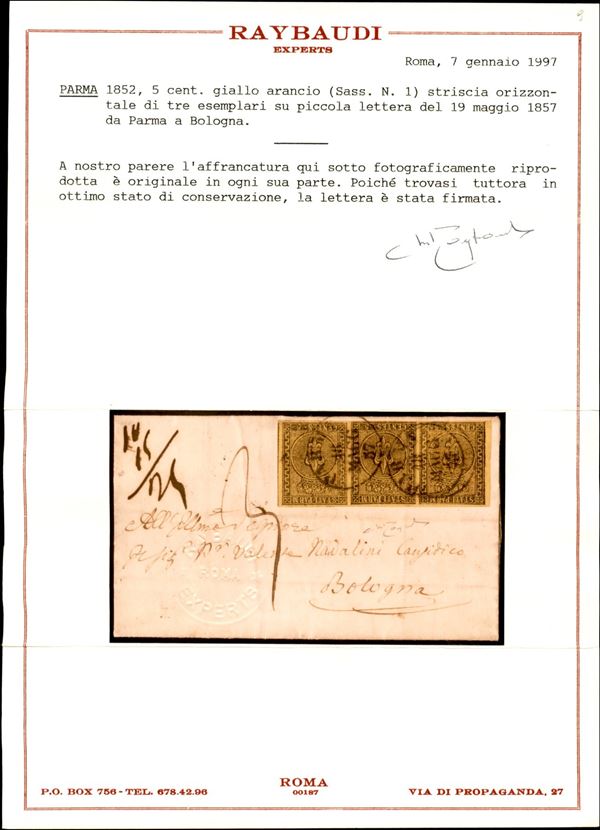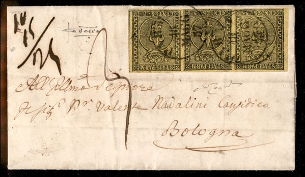 Lettera con striscia di tre c.5 giallo arancio con lineare su tre righe MONTICELLI D'ONGINA 28 LUGLIO del 1858 per Piacenza (P.ti 8) - cert. Raybaudi