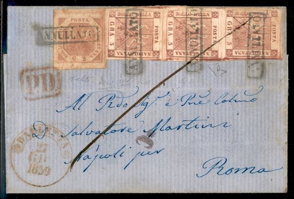 Lettera con striscia di tre del 5 grana + esemplare 2 grana (8+7) da Barletta per Roma del 27.1.59 - pagata a destino - Diena