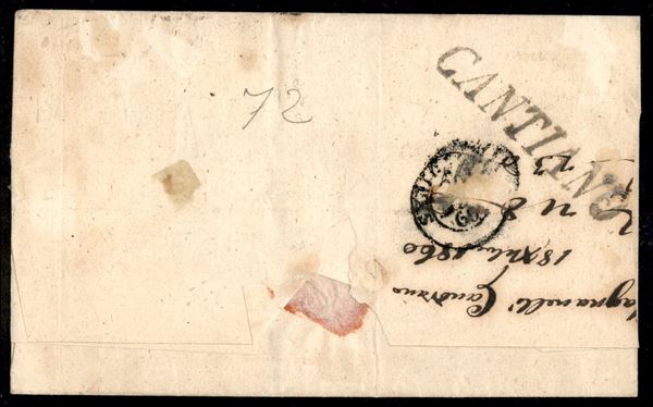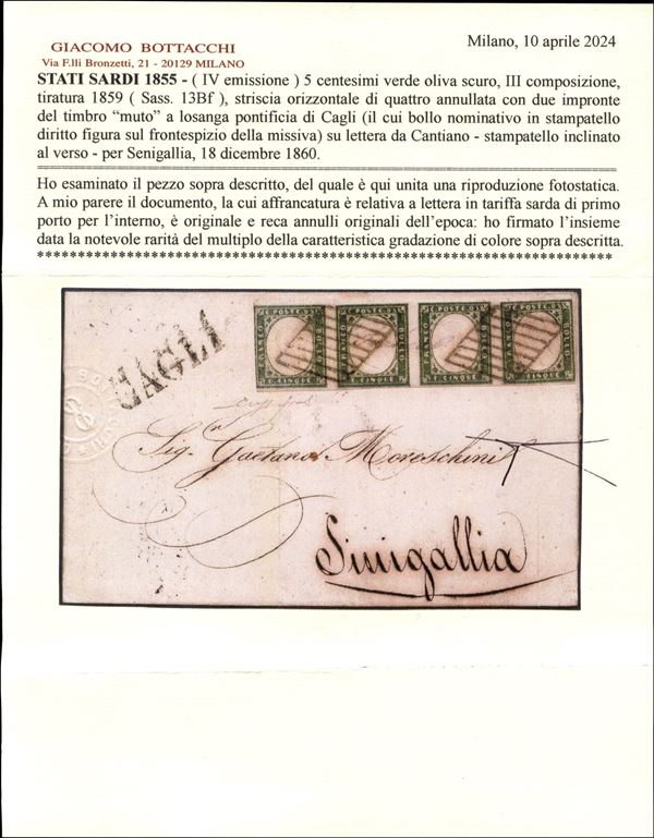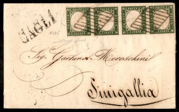 Lettera con striscia orizzontale di quattro del c.5 verde oliva scuso (13Bf) III composizione, tiratura del 1859, colore particolarmente intenso, la striscia è annullata con due impronte del muto a losanga di fornitura pontifica di CAGLI, lineare apposto a lato, in partenza da CANTIANO, lineare al verso e diretta a Senigallia con bollo di arrivo del 18 dicembre 1860, notevolmente rari i multipli di questa caratteristica gradazione di colore. Cert. G.Bottacchi