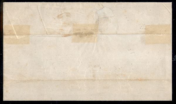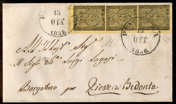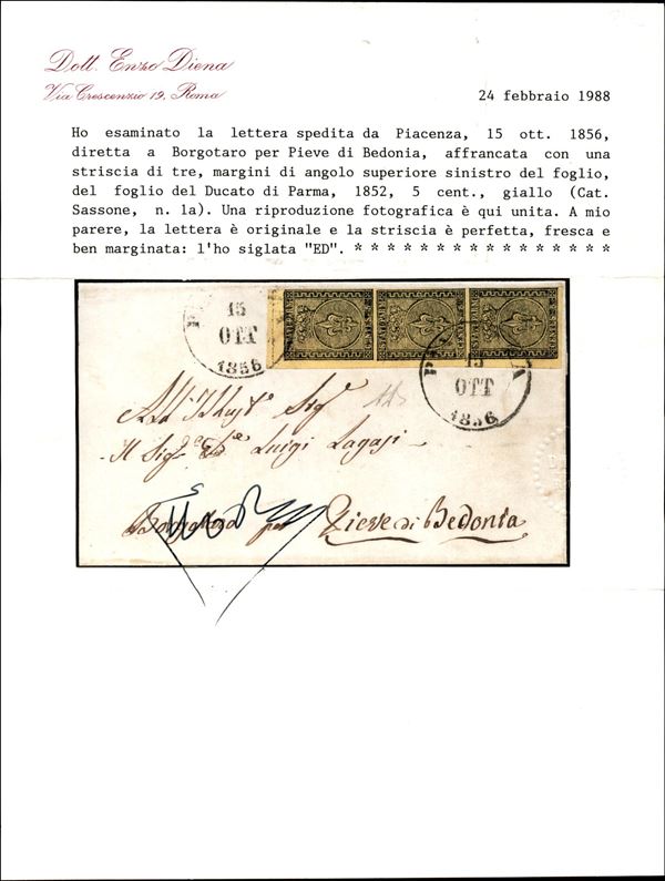 Lettera con striscia verticale di tre c.5 giallo arancio, angolo di foglio con annullo PIACENZA 15 OTT 1856, annullo del secondo tipo, per Borgotaro a Pieve di Bedonia, cerrt. E.Diena, rara e MB