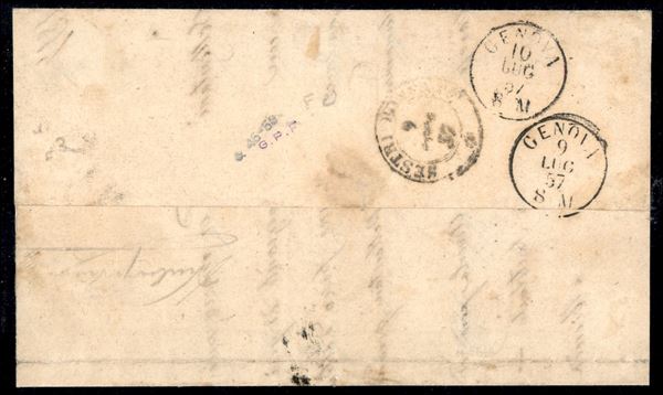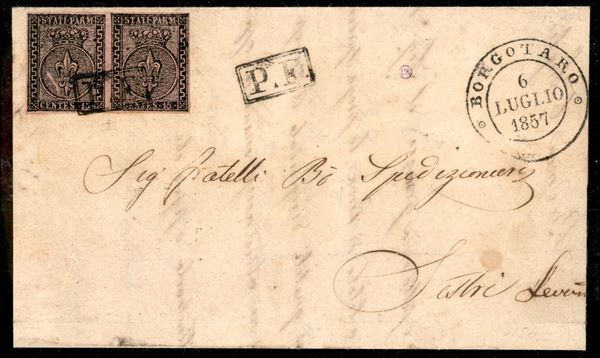 Lettera da BORGOTARO 6 LUGLIO 1857 con coppia c.15 rosa annullati dal bollo P.D. in cartella, anche ripetuto a lato, diretta a Sestri levante (P.TI 8).