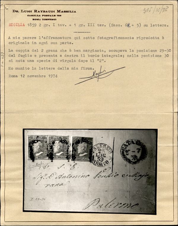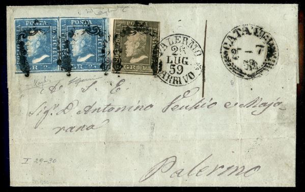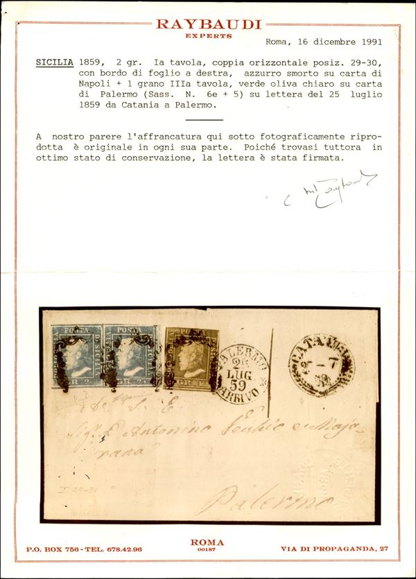 Lettera da Catania 25-7 59 affrancata con coppia del 2 grana azzurro smorto I tavola carta di Napoli + 1 grano verde oliva chiaro III tavola (6e + 5) per Palermo - cert. Raybaudi Luigi + Maurizio