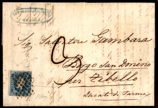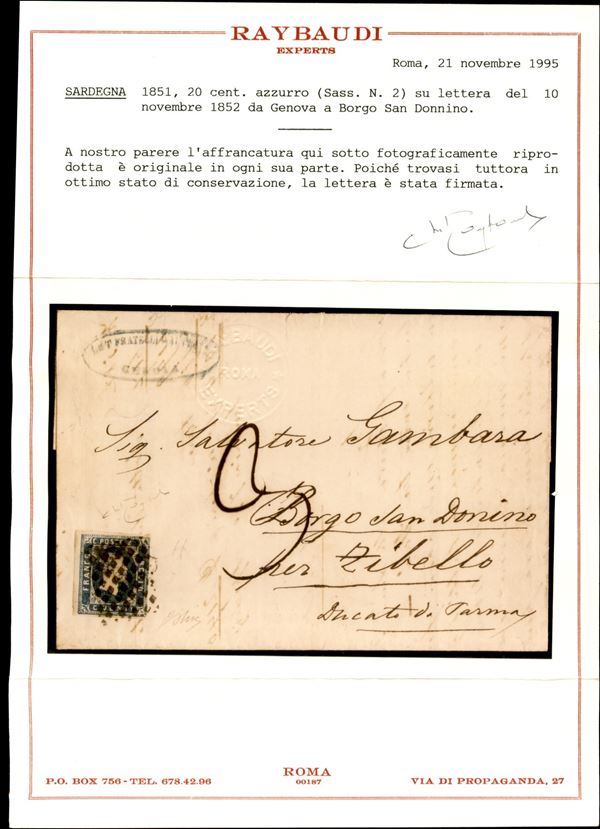 Lettera da Genova del 10 novembre 1852 affrancata con c.20 azzurro (2) di Sardegna e diretta a Zibello con segno di tassa 3 decimi in periodo preconvenzione, firma Vaccari cert. Raybaudi