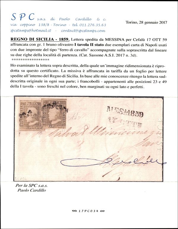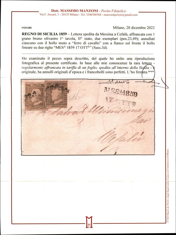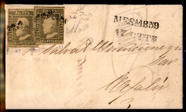 Lettera da Messina a Cefalù 17 ottobre 1859 affrancata con 2 esemplari del 1 gr. bruno olivastro I tav. II stato (Sass. 3d) rara cert.Manzoni