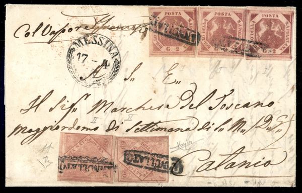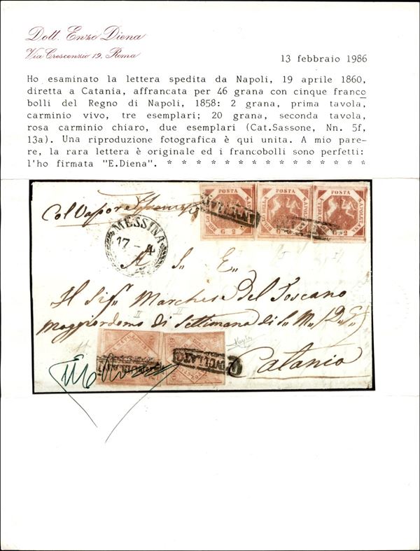 Lettera da Napoli 19 APR.1860 viaggiata coi vapori per Catania affrancata per 46 grana co tre esemplari del 2 grana carminio vivo I tavola + due esemplari del 20 grana rosa carminio chiaro II tavola (5f + 13a cat.27000+) - firma AD + cert. Enzo Diena