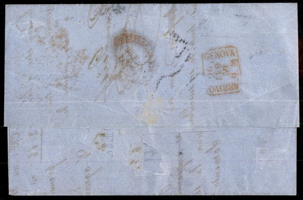 Lettera da Napoli 23 febbraio 1859 viaggiata per mare con "Vapore Durance" affrancata con 1 gr. + 2 gr. + 10 gr. + 20 gr. (3 + 7 + 10 + 12 cat. 7.000) - firma AD e Chiavarello